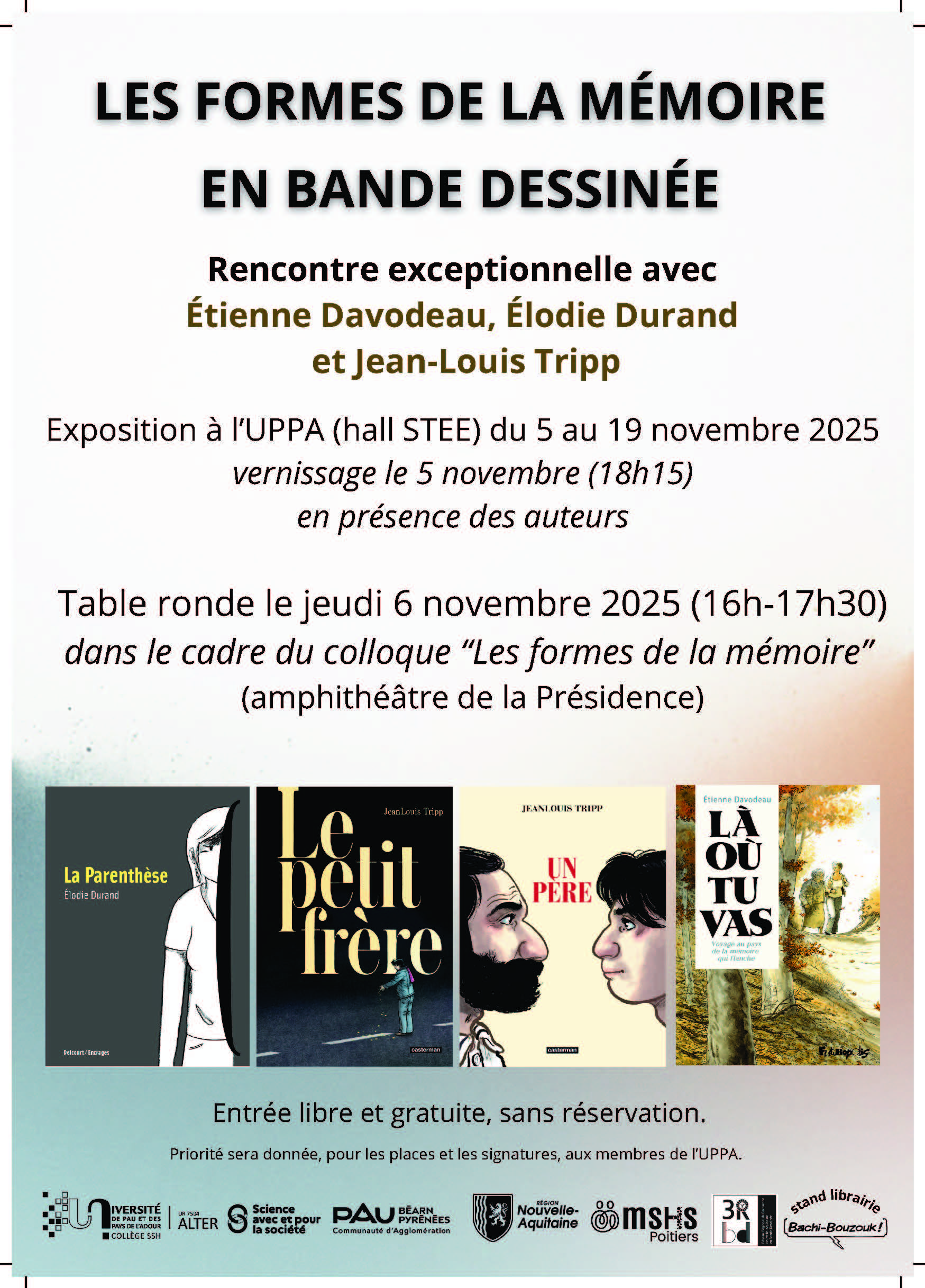 À cette occasion, une exposition de planches de bandes dessinées sera installée du 5 au 19 novembre dans le hall des sciences du campus de Pau. Ces reproductions de planches sont tirées de plusieurs œuvres (Là où tu vas : voyage au pays de la mémoire qui flanche, La Parenthèse, Le Petit Frère et Un père) dont le commentaire est le fruit du travail mené en cours sur la période septembre-octobre par une quarantaine d’étudiants de licence et de master. Des planches extraites de la revue Ébullitions seront également affichées.