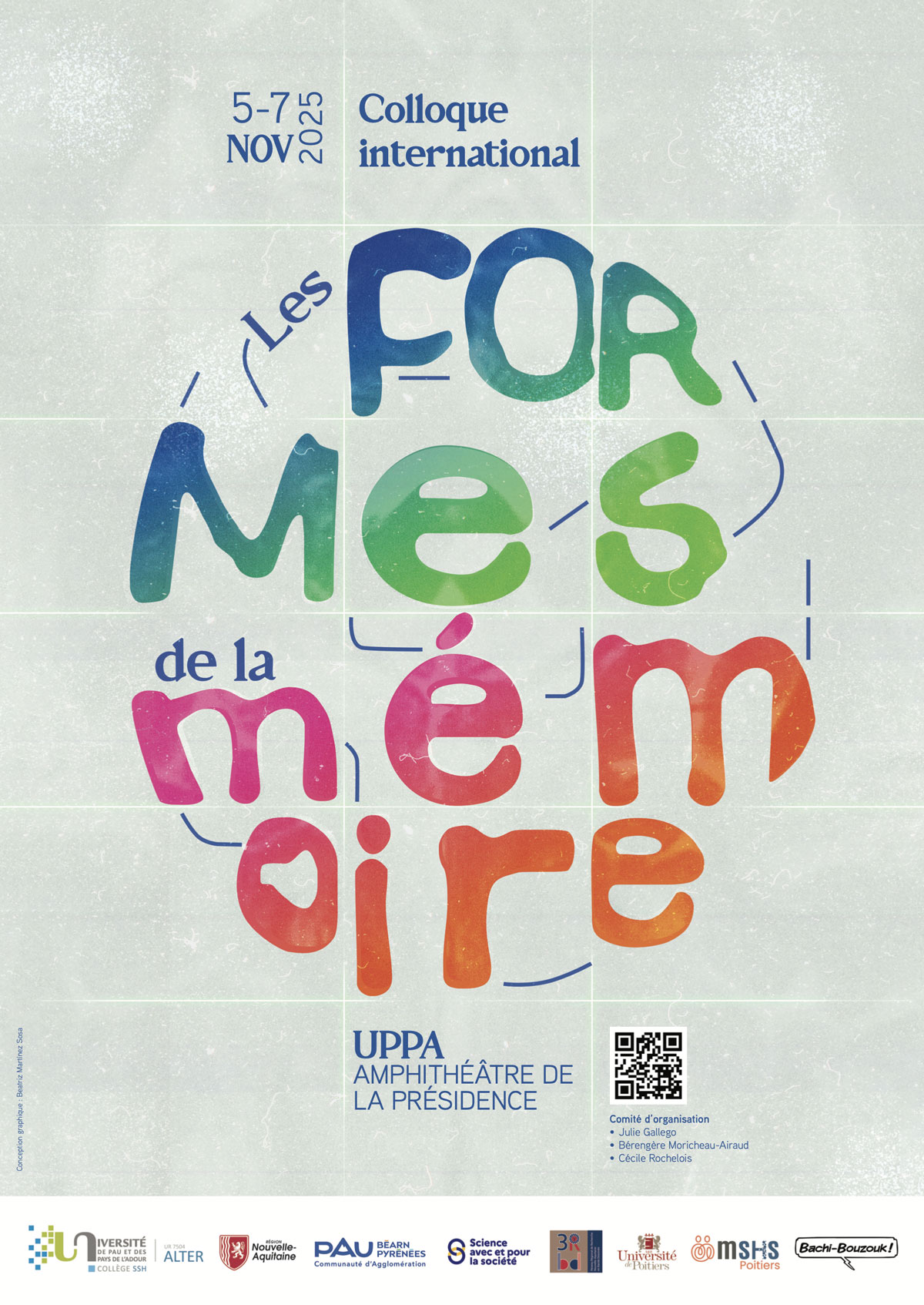 Du 5 au 7 novembre 2025, le laboratoire ALTER de l'UPPA organise un colloque international sur le thème "Les formes de la mémoire" sur le campus de Pau (amphithéâtre de la Présidence).